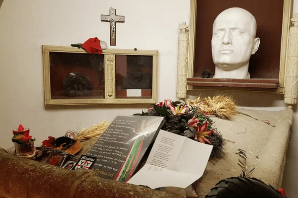 Desde aquel momento, el fundador del fascismo descansa junto a sus padres, hijos y otros familiares. El sepulcro de granito que contiene los restos de Benito Mussolini está coronado por un enorme busto de mármol. Por detrás están exhibidos objetos personales y un recipiente, que dicen, contiene parte de su cerebro.