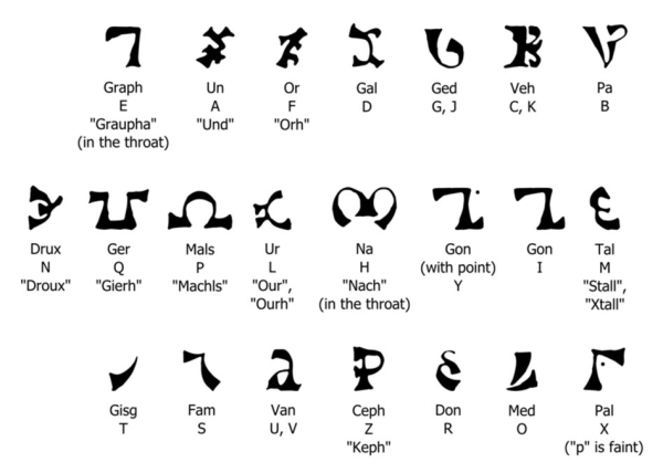 Algunas letras enoquianas tienen equivalentes en las letras inglesas y una pronunciación similar, pero muchas de ellas se pronuncian de forma diferente. El alfabeto se usa en la práctica de magia Enoquiana sobre Claves Angélicas o Enoquianas. Llegó hasta nosotros por medio de Edward Kelley en 1584, en Cracovia (Polonia).