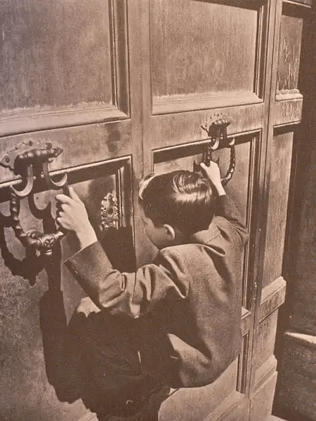 El ojo de la cerradura actúa como una cámara oscura, creando una imagen proyectada de la lejana basílica en la pared interior de la puerta.