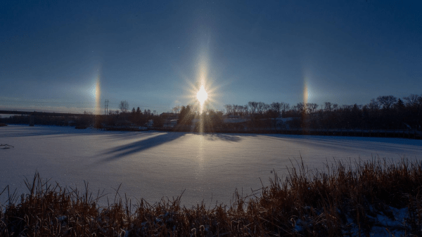 En 2018 en China se produjo este curioso espejismo meteorológico, que se da a causa de la refracción de la luz sobre los cristales de hielo que se encuentran en las nubes cirriformes. Los cristales tienen forma hexagonal y cuando la luz incide sobre ellos se refleja a ambos lados del sol, formando un ángulo de 22º respecto al mismo.