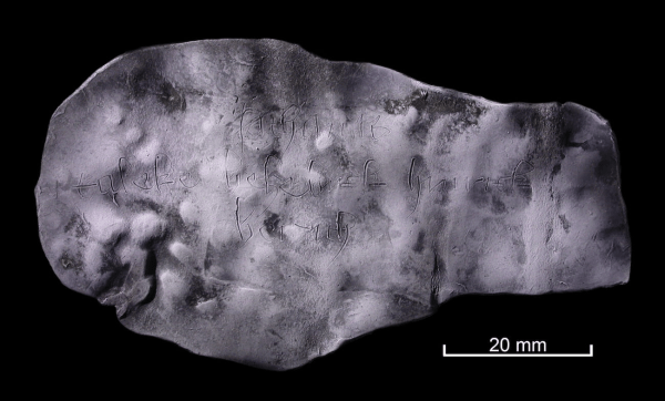 La escritura de las minúsculas góticas apenas es reconocible a simple vista. Se trata de una escritura establecida, no de un garabato. La tablilla fue descubierta en el suelo de una letrina al final de una propiedad.