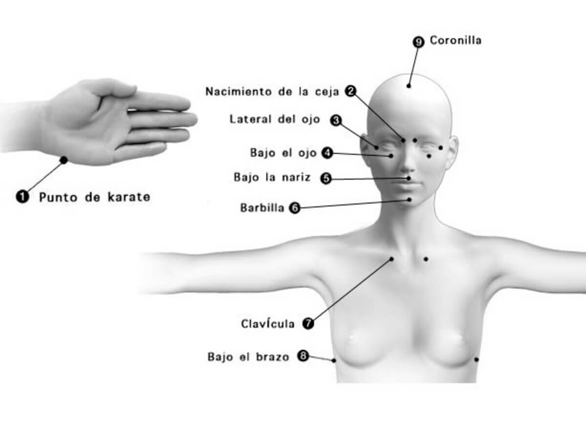 Haz tapping en cada uno de los siguientes puntos meridianos, alrededor de siete veces en cada uno, mientras repites una frase recordatoria. Dicha frase es una versión corta de la afirmación de la etapa de preparación. En este caso, podría ser «estrés». La idea es que te recuerde la razón por la que estás haciendo el ejercicio.