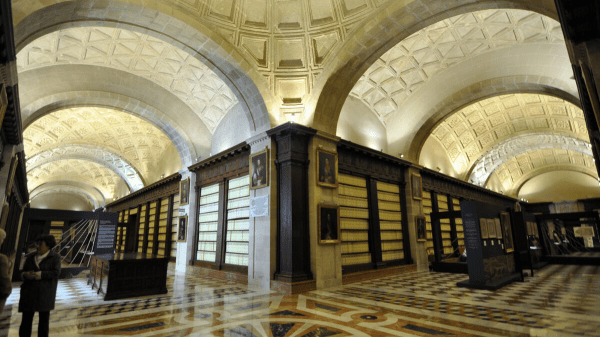 El edificio tuvo que ser adaptado a sus nuevas funciones literarias. La responsabilidad de las obras recayó sobre el arquitecto navarro Lucas Cintora, quien optó por liberar los interiores de las esbeltas galerías y revestir suelos y espacios como la escalera principal con mármoles y jaspes. Sobre las paredes se desplegaron las célebres estanterías diseñadas por el imaginero Blas Molner en madera de cedro macho y caoba de Cuba.