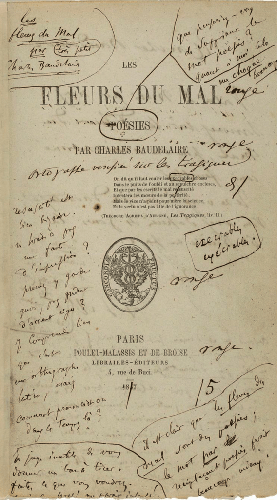 El 25 de junio de 1857, después de una infinidad de correcciones obsesivas, reescrituras y peleas con su editor Baudelaire publicó su primer y más famoso volumen de poemas, Las flores del mal. Los poemas encontraron una audiencia pequeña pero entusiasta. Los temas sobre los que el libro trataba, sin embargo, crearon un escándalo público.