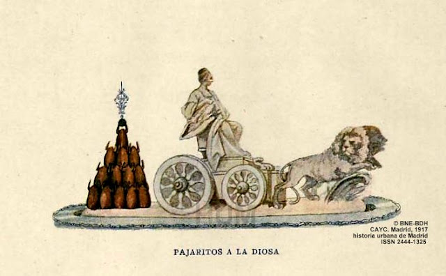 Hoy toca rendir homenaje a nuestra diosa Cibeles que, en decorada bandeja, comparte espacio con un producto de antaño y hogaño: los pajaritos, aquellos que hasta bien entrado el siglo XX se ofrecían fritos en algunas tabernas madrileñas.