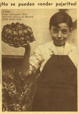 También en 1933, la Sociedad Protectora de Animales conseguía que el gobernador prohibiese su venta, que había alcanzado un precio abusivo. En la siguiente imagen podemos apreciar aquellas pirámides de avecillas que muestra con orgullo un pinche de cocina, y el aviso: «¡No se pueden vender pajaritos!«.