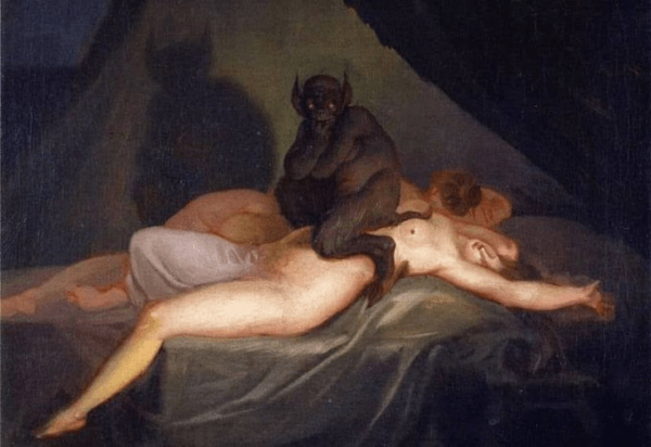 La sensación de opresión sobre el pecho, típica de los episodios de parálisis, era explicada por la presencia de estos seres literalmente sobre nosotros. La obra La pesadilla, del pintor suizo Henry Fuseli, representa a la perfección dicha creencia, incluyendo, tal vez como un guiño literal al vocablo, una yegua oscura en el fondo del cuadro.