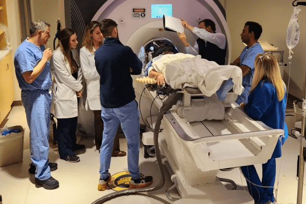 Así que el centro médico de Golby, el hospital Brigham and Women’s, y varios otros obtuvieron permiso de la Administración de Alimentos y Medicamentos de Estados Unidos para realizar un ensayo clínico, utilizando ultrasonidos focalizados con microburbujas para administrar una mayor cantidad de quimioterapia. Fue financiado por Insightec.