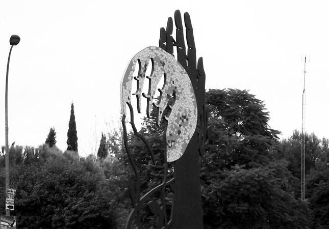 Si la dejamos atrás y bajamos algo más por la Calle Real, hasta llegar a la entrada del pueblo, la calle Inés Rosales encuentra su particular correlato. Se levanta un pequeño monumento justo en la rotunda de acceso, una construcción consistente en dos manos que sostienen una torta de aceite.
