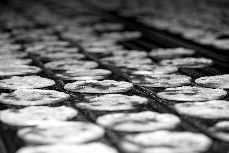 En poco tiempo se ponen al mismo ritmo de las demás”. Las labradoras amasan a mano y una por una las tortas, según van pasando por una cinta de trabajo que viene directamente de los contenedores de mezcla de ingredientes. Luego va hacia el horno, donde son cocinadas y posteriormente enfriadas.