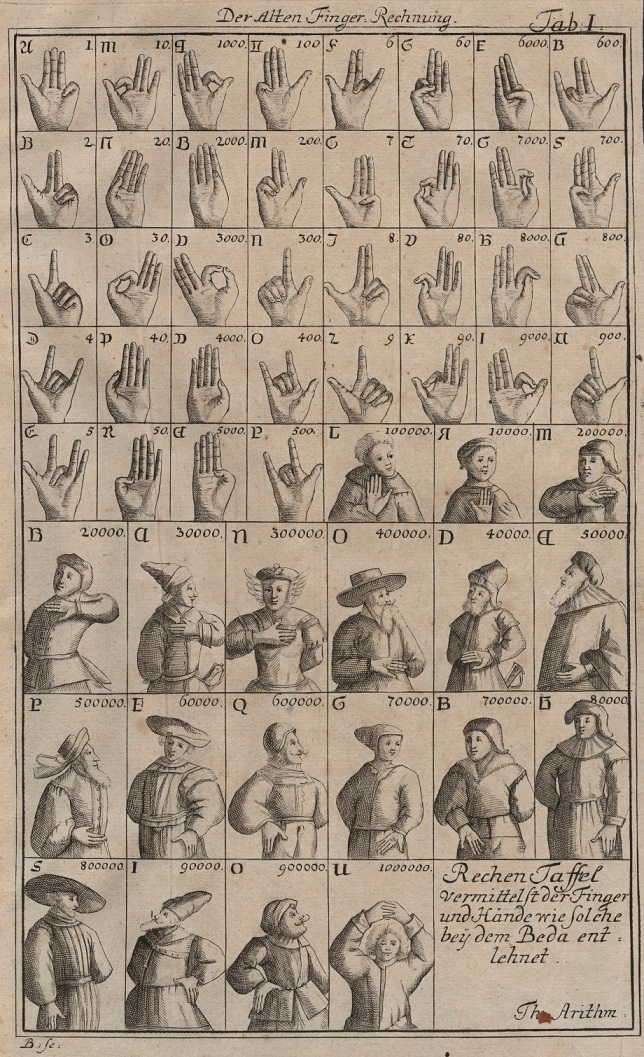 Quintiliano hace mención también de esta tradición y señala que el conocimiento de los números no es sólo indispensable para el orador e indica que un abogado que muestra torpeza contando con los dedos da una pésima imagen de sí mismo. Si os habéis dado cuenta, ya no solo hablamos de contar los dedos, sino también de cómo se representaban los números con los dedos. Y para ello tenemos que recurrir a Beda el Venerable, un monje benedictino de Northumbria (Gran Bretaña).
