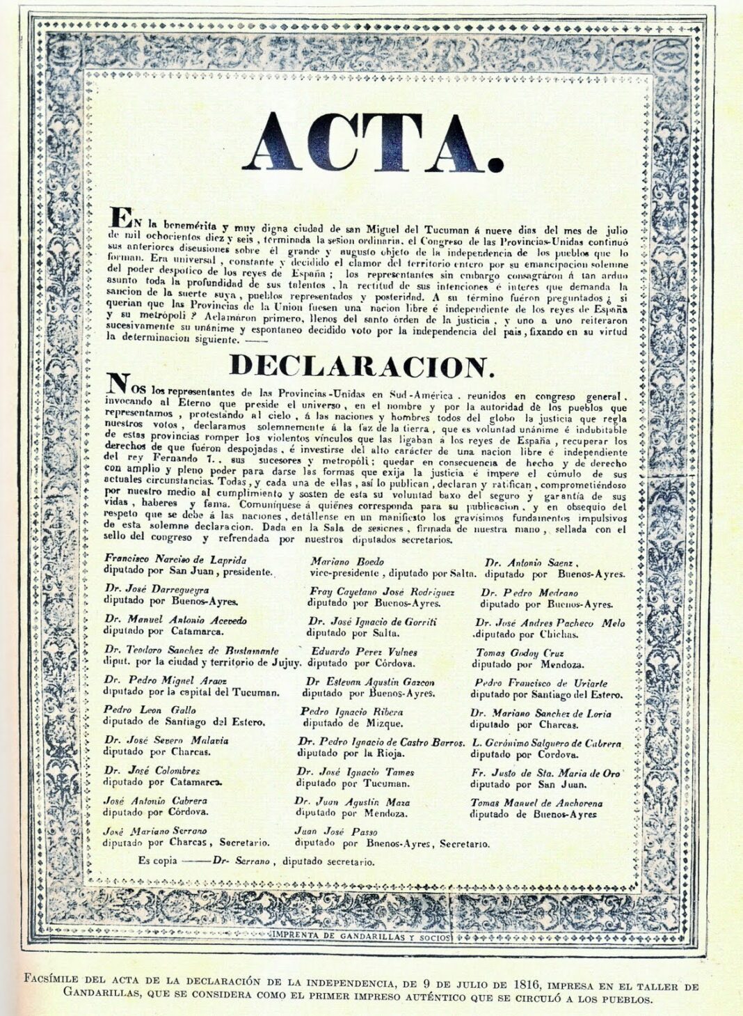 El acta dice: “En la benemérita y muy digna ciudad de San Miguel de Tucumán, a nueve días del mes de julio de mil ochocientos diez y seis: terminada la sesión ordinaria, el Congreso de las Provincias Unidas continuó sus anteriores discusiones sobre el grande, augusto y sagrado objeto de la independencia de los pueblos que lo forman. Era universal, constante y decidido el clamor del territorio por su emancipación solemne del poder despótico de los reyes de España; los representantes sin embargo consagraron a tan arduo asunto toda la profundidad de sus talentos, la rectitud de sus intenciones e interés que demanda la sanción de la suerte suya, pueblos representados y posteridad. A su término fueron preguntados si quieren que las provincias de la Unión fuese una nación libre e independiente de los reyes de España y su metrópoli. Aclamaron primeramente llenos de santo ardor de la justicia, y uno a uno reiteraron sucesivamente su unánime y espontáneo decidido voto por la independencia del país, fijando en su virtud la determinación siguiente: