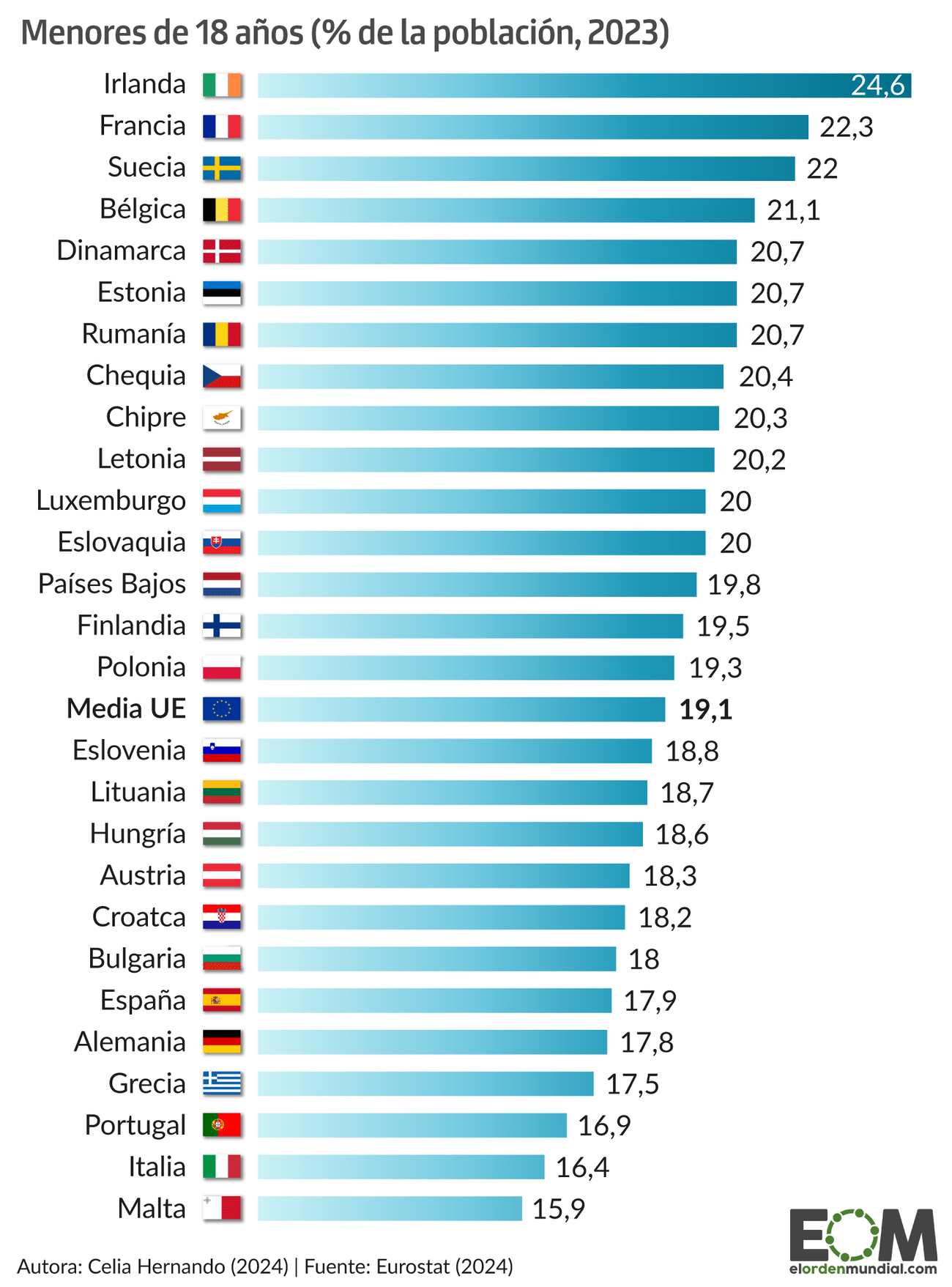 En Irlanda, el país con más porcentaje de menores de 18 años, este grupo supone casi un cuarto de la población, el 24,6% en 2023. Le siguen Francia (22,3%), Suecia (22%) y Bélgica (21,1%). Son todos países del centro y norte del continente, caracterizados por sus sistemas de bienestar robustos, acceso a servicios públicos de calidad y políticas de conciliación laboral y familiar. También se benefician de una inmigración que contribuye, con unas tasas de natalidad más elevadas, a rejuvenecer la población.